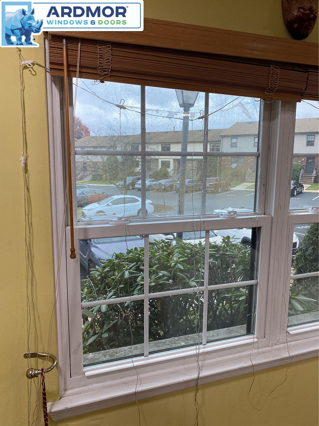 For our client in Woodbridge Township, New Jersey, we completed foggy glass replacement in their vinyl double-hung unit. The new Cardinal LoDz-272 insulated glass with argon and GBG grids restores clarity and significantly improves thermal performance.
