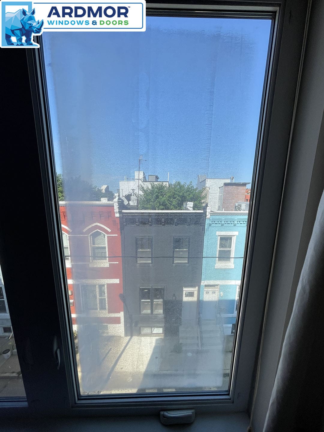 Fogged glass not only ruins the view but also compromises home insulation and may contribute to mold growth over time. In this Philadelphia project, we replaced the damaged pane in a vinyl casement window with Cardinal glass – known for its durability, energy efficiency, and 20-year warranty. The result is a clear view, improved comfort, and restored window performance.