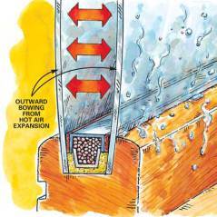 Perimeter seals can soften and panes can literally bow outward from hot air expansion between panes. Lots of expansion and contraction can actually turn windows into “mini-pumps” that pull in and push out outside air, a real problem if it’s moist air. South-facing windows are the hardest hit.
